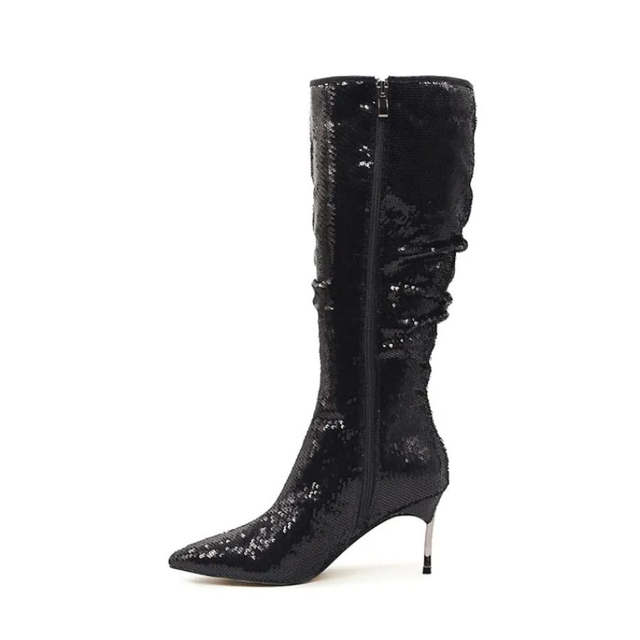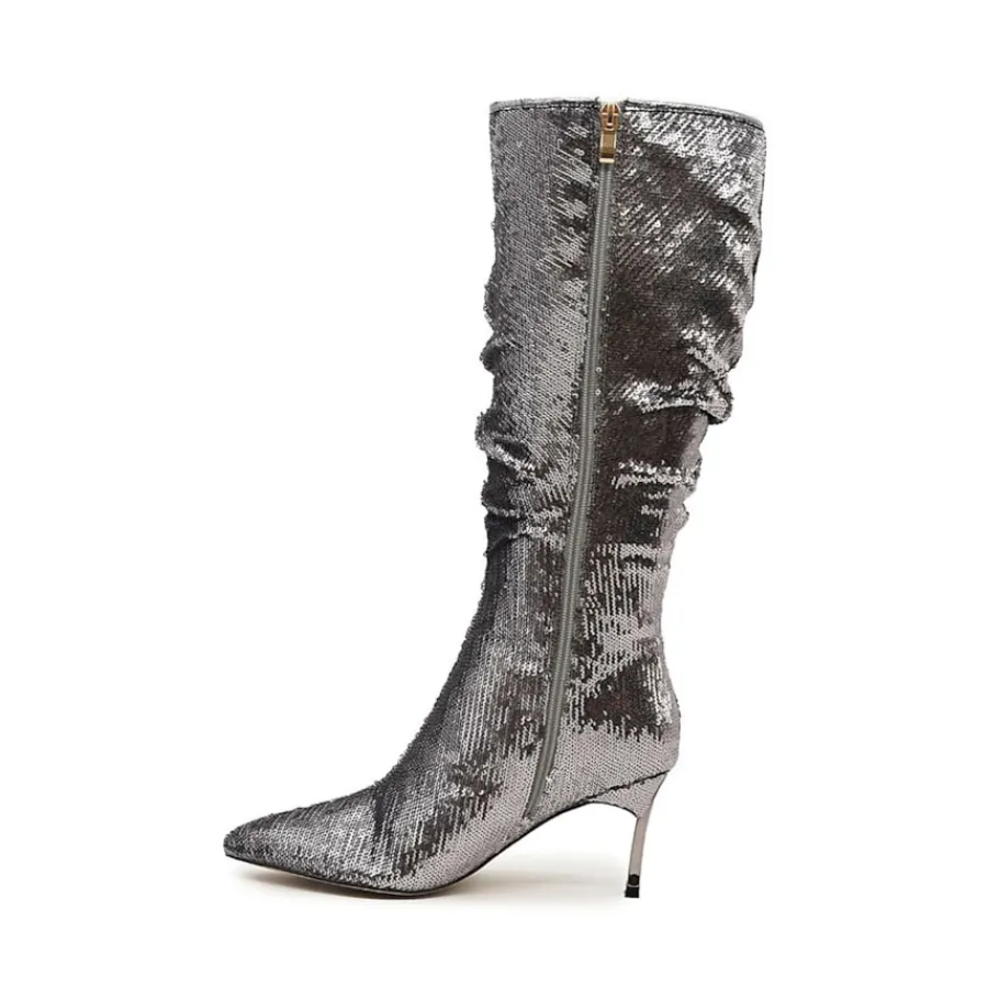 Fique deslumbrante com esta bota alta de lantejoulas com zíper interno. As lantejoulas brilham na luz para lhe dar um visual noturno deslumbrante. Essa bota é perfeita para usar em festas e eventos noturnos, sem perder aquele toque de glamour.Altura da cana 40 cmAltura do salto 7 cm