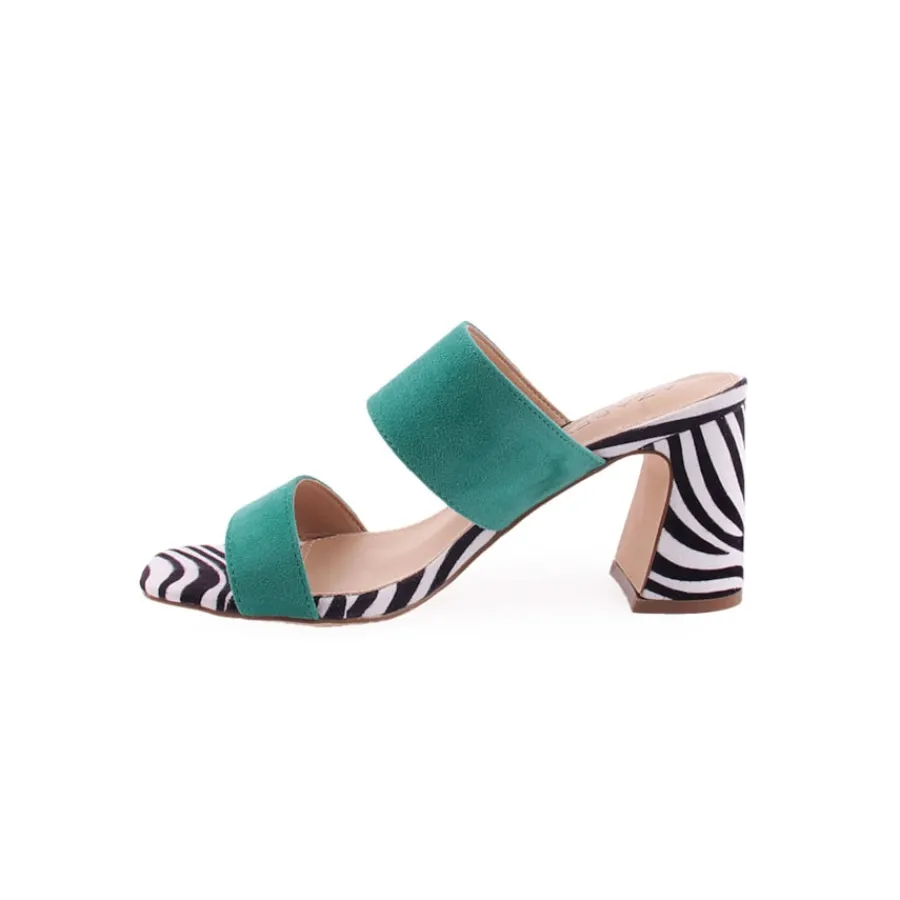 Chinelos de mulher com padrão de zebra no salto largo. Salto com 7cm de altura.