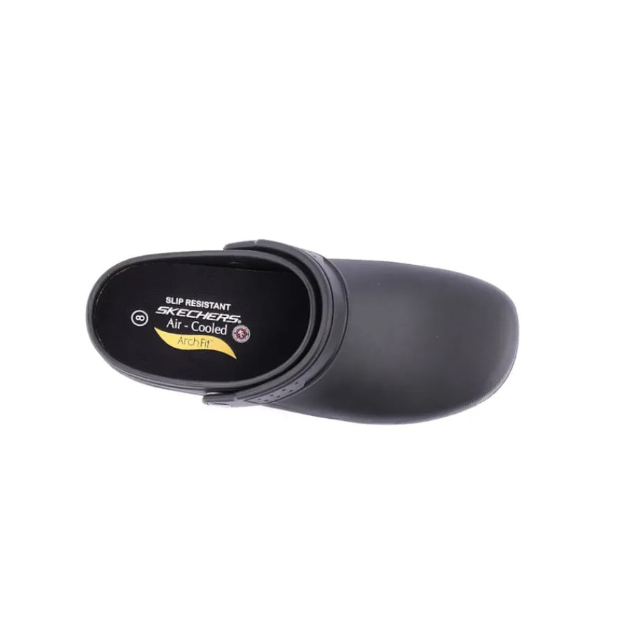 Vista conforto de suporte antes de iniciar seu trabalho de preparação com Skechers Work™ Arch Fit®: Riverbound SR. Este tamanco antiderrapante apresenta uma parte superior em EVA flexível esculpida com uma palmilha removível com contorno Arch Fit® e uma tira de calcanhar conversível.Palmilha com contorno Skechers Arch Fit® patenteada com suporte de arco certificado por podólogo