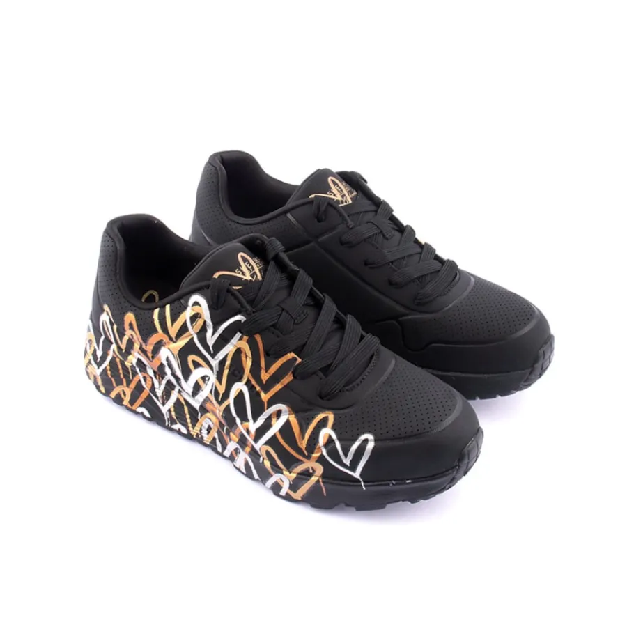 O muralista de renome internacional James Goldcrown traz à Skechers os seus emblemáticos designs com corações #Lovewall nesta colaboração inspiradora. Mostra o teu estilo criativo com as Skechers Street™ x JGoldcrown: Uno Lite – Metallic Love. Estas sapatilhas modernas com atacadores têm uma impressão metálica do design de coração de graffiti caraterístico do artista que se estende até à entressola, parte superior em durabuck sintético e acabamento perfurado com palmilhas Skechers Air-Cooled Mem