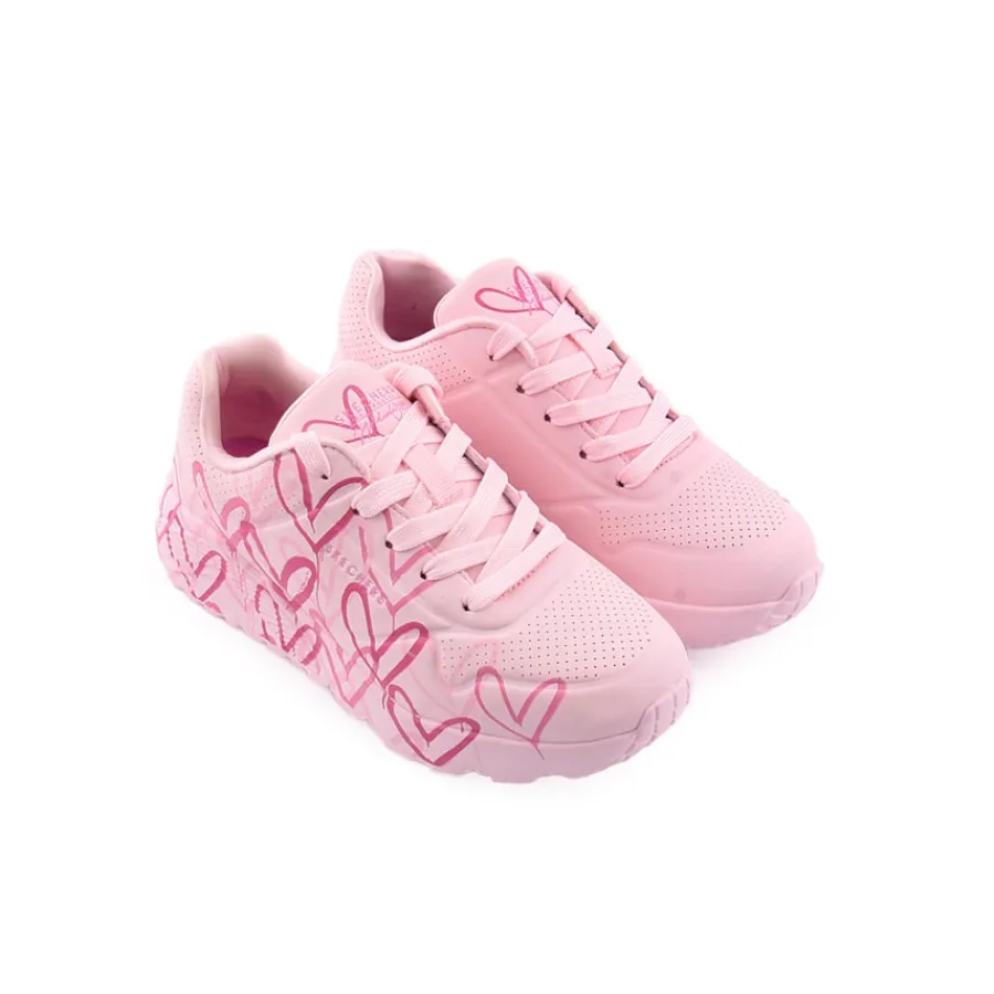 O muralista de renome internacional James Goldcrown traz seus icônicos designs de coração #Lovewall para a Skechers nesta colaboração inspiradora. O estilo fofo e colorido se encontra no Skechers x JGoldcrown: Skechers Street™ Uno Lite – Espalhe a alegria. Este tênis fashion com cadarço apresenta uma impressão completa do design do coração do artista que se estende até a sola, durabuck sintético e parte superior aparada perfurada com uma palmilha Skechers Air-Cooled Memory Foam® e uma cunha de p