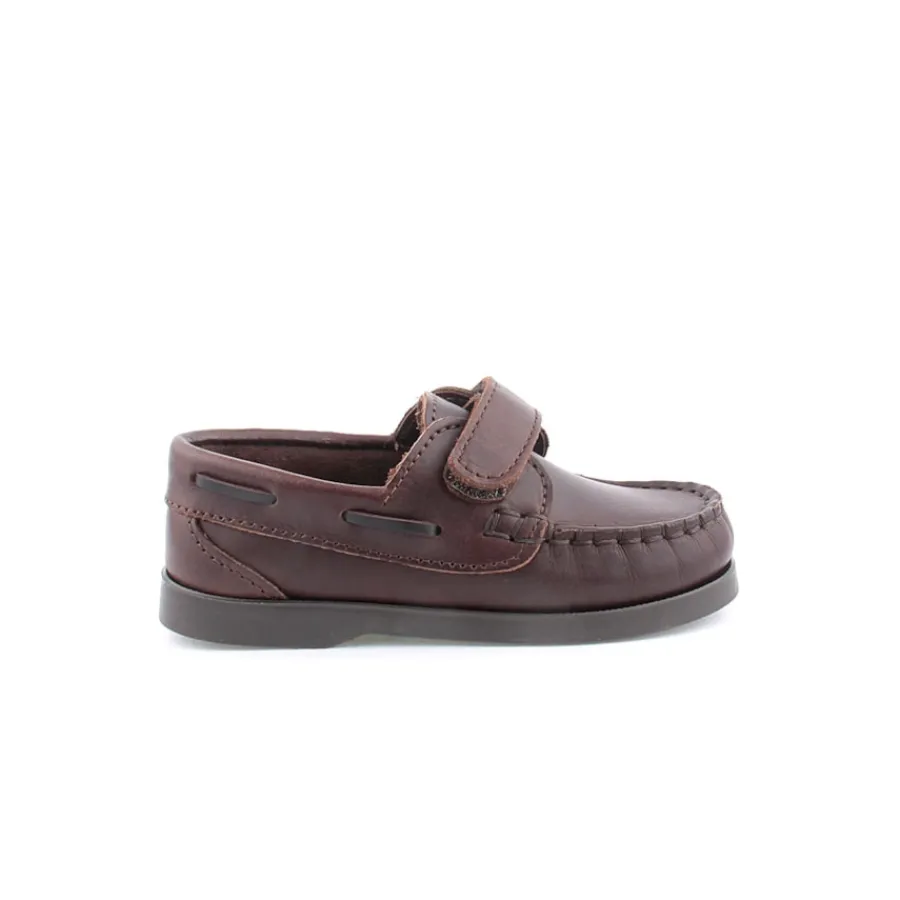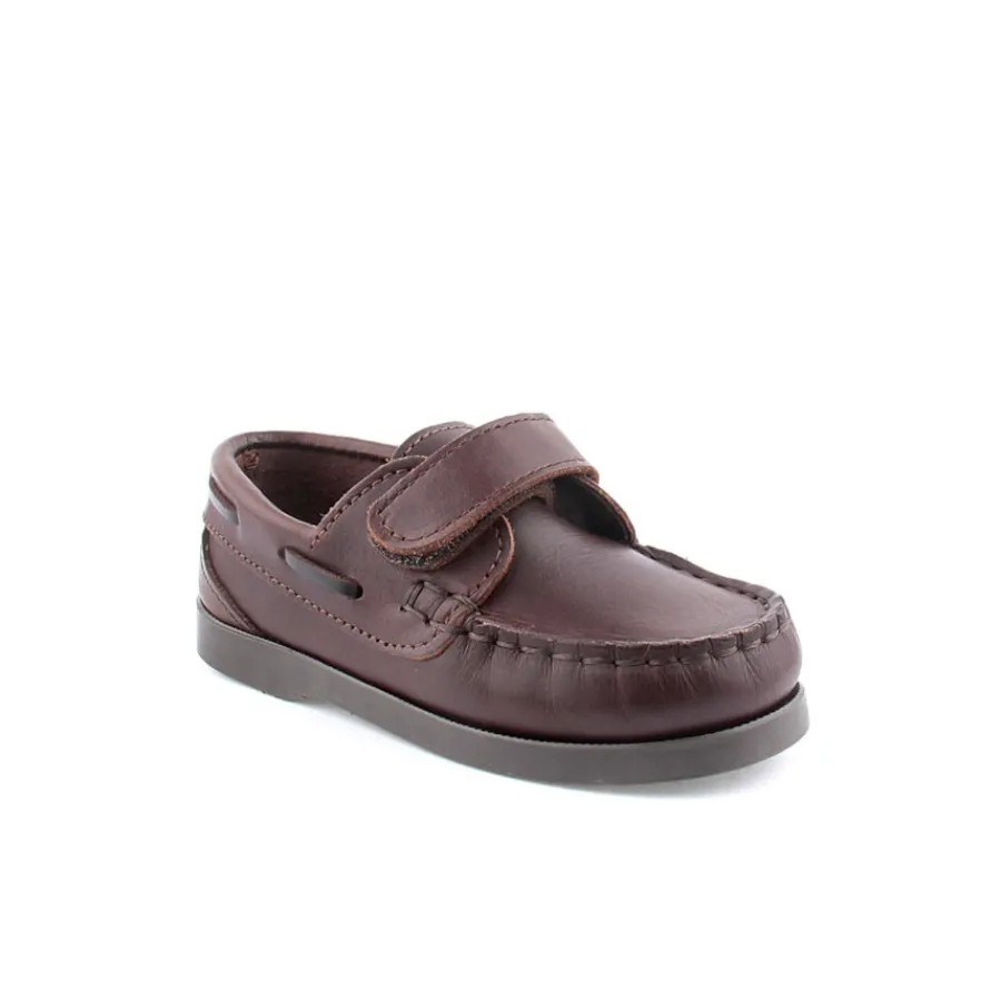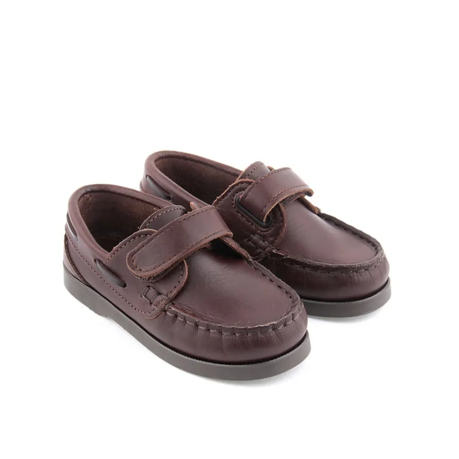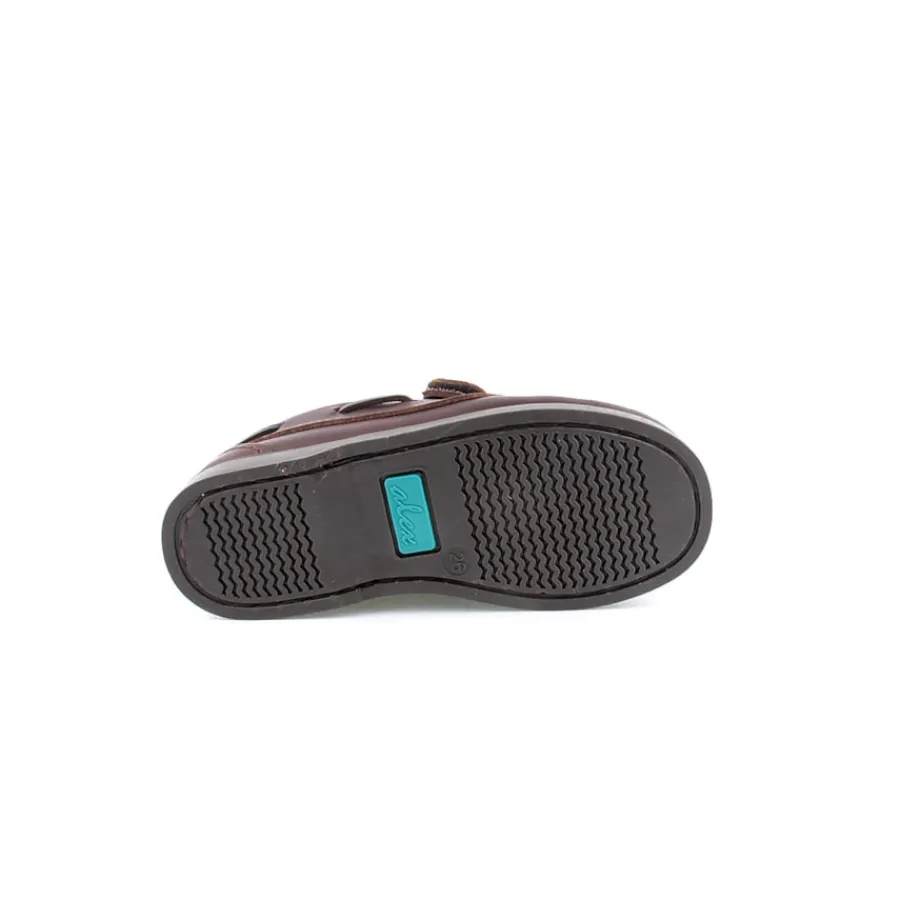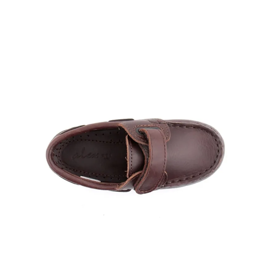 Sapato em pele para criança com fita em velcro. Disponível nas cores azul e castanho.