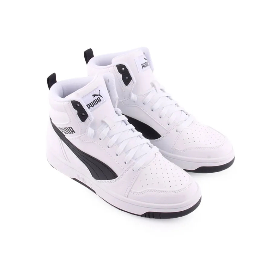 Ténis branco da Puma com um design desportivo, cano médio, confortáveis e práticos para o dia à dia dos mais pequenos.