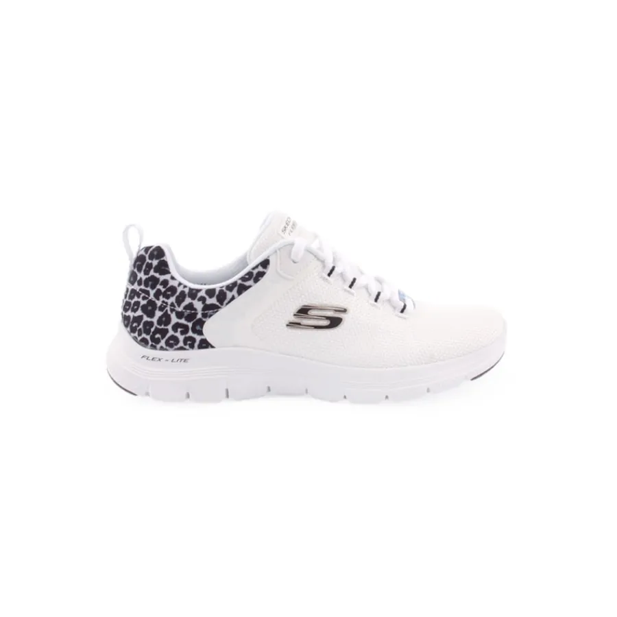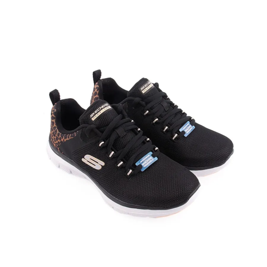 Sai de casa em conforto perfeito com Skechers Flex Appeal® 4.0 – Wild Ballad. Estes ténis vegan com atacadores têm uma parte superior em rede com enfeite no calcanhar de padrão de leopardo e uma palmilha almofadada Air-Cooled Memory Foam®.