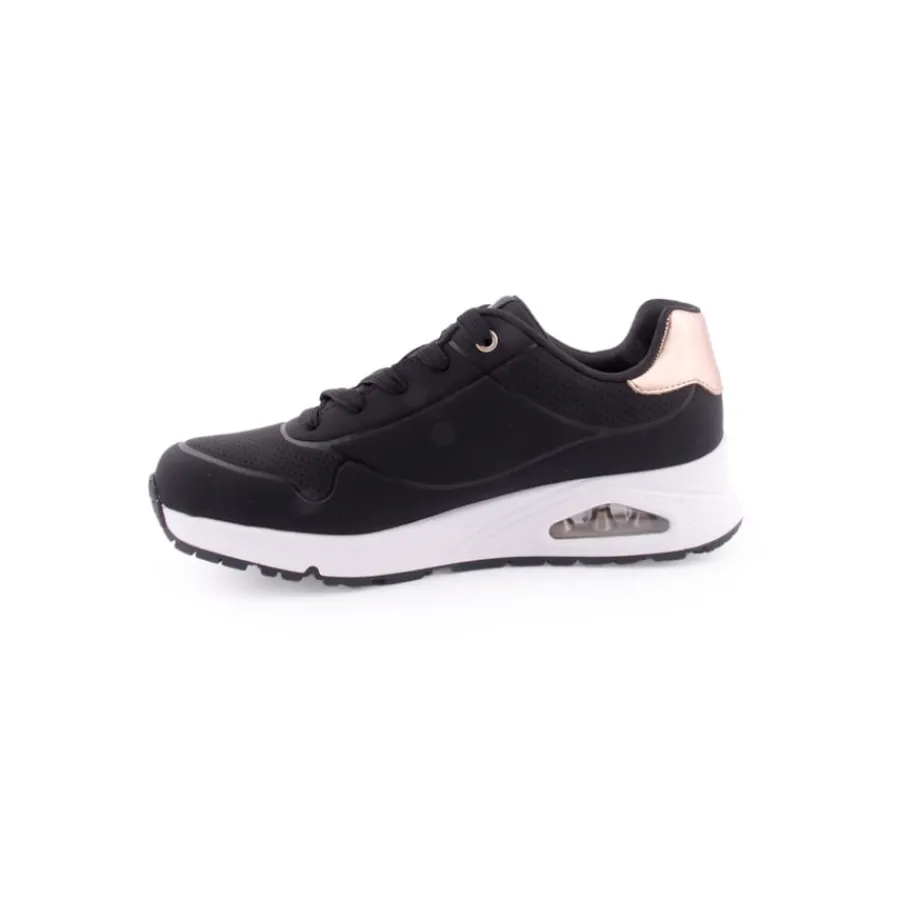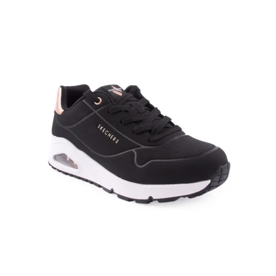 Destaca-te no conforto almofadado das sapatilhas Skechers Street™ Uno Gen1 – Shimmer Away. Estas sapatilhas modernas com atacadores têm parte superior em material sintético duraleather e acabamento metálico, palmilhas confortáveis Skechers Air-Cooled Memory Foam® e entressola visívelSkech-Air® com airbag.