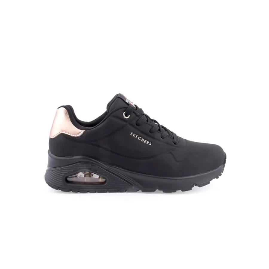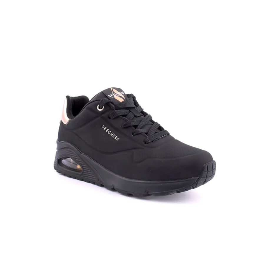 Escolhe o ouro e melhora o teu estilo com Skechers Street™ Uno – Golden Air. Este modelo moderno com atacadores apresenta uma parte superior em material sintético durabuck com destaque dourados, palmilha almofadada Skechers Air-Cooled Memory Foam® e uma entressola com caixa de ar Skech-Air® visível.