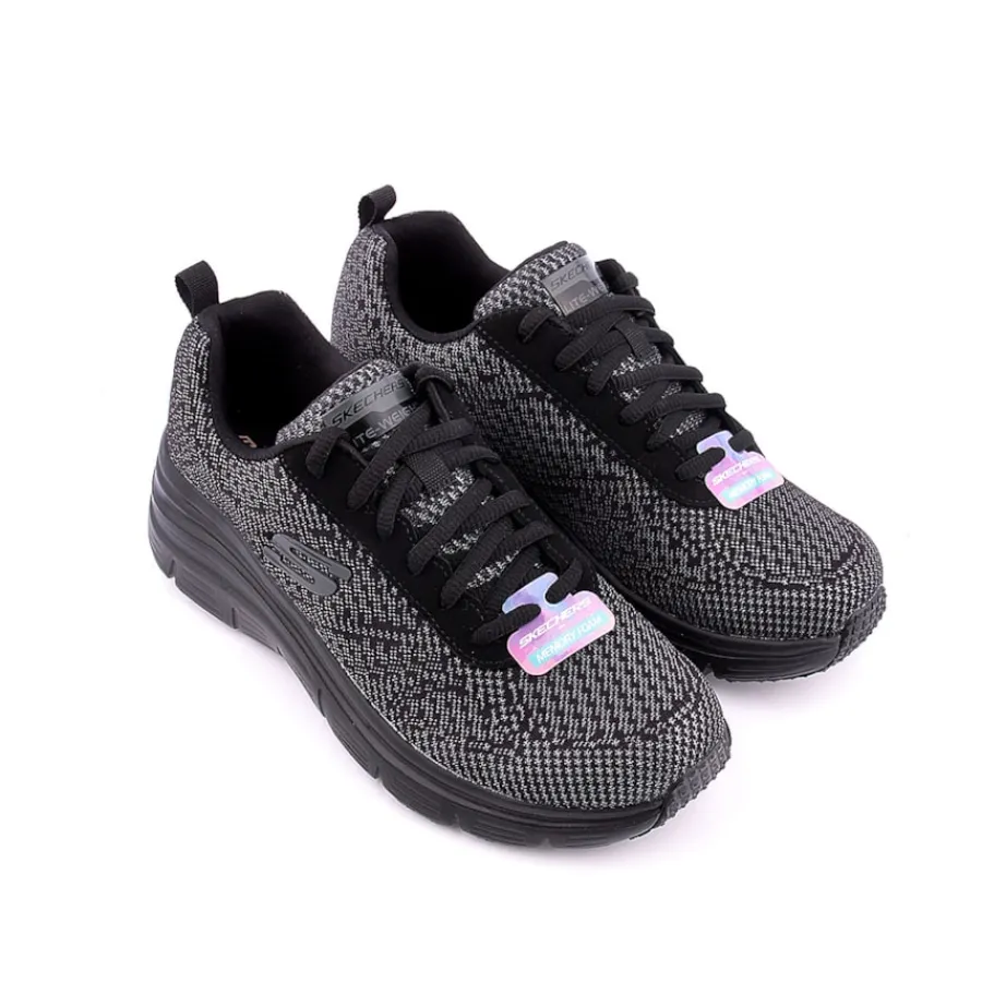 Acrescenta um pouco mais de estilo ao teu look desportivo com os Skechrs Fashion Fit 12719-BBK, para mulhe, pretos. Parte superior em tecido de rede desportivo liso e suave numas confortáveis sapatilhas modernas desportivas com atacadores, detalhes de costura e palmilhas Air Cooled Memory Foam.