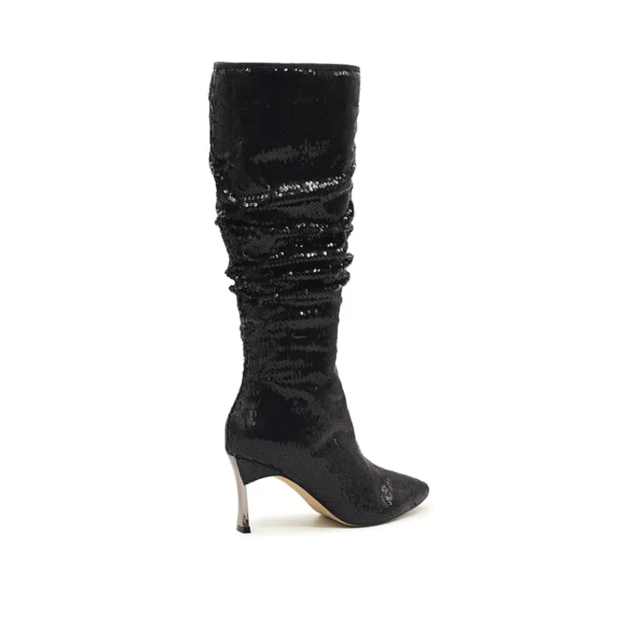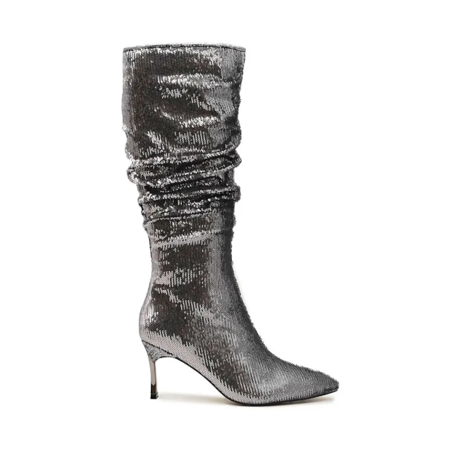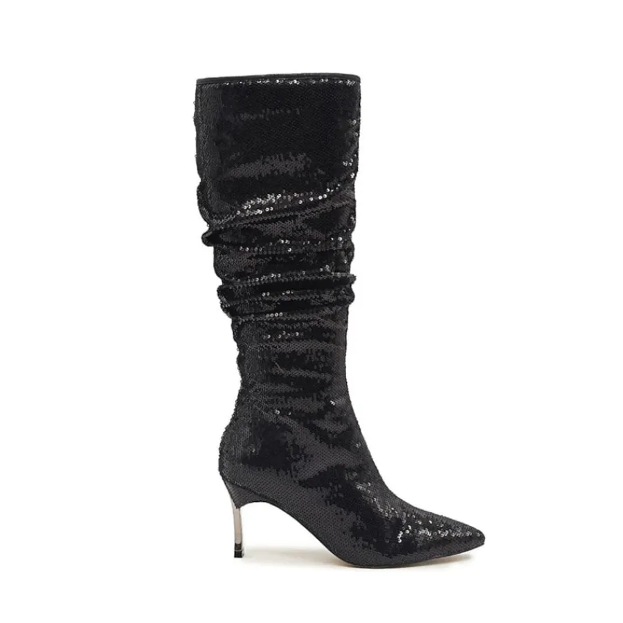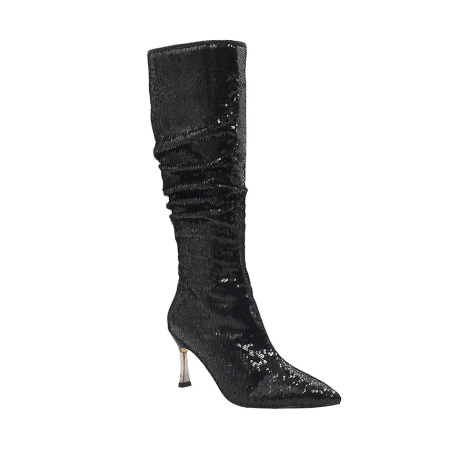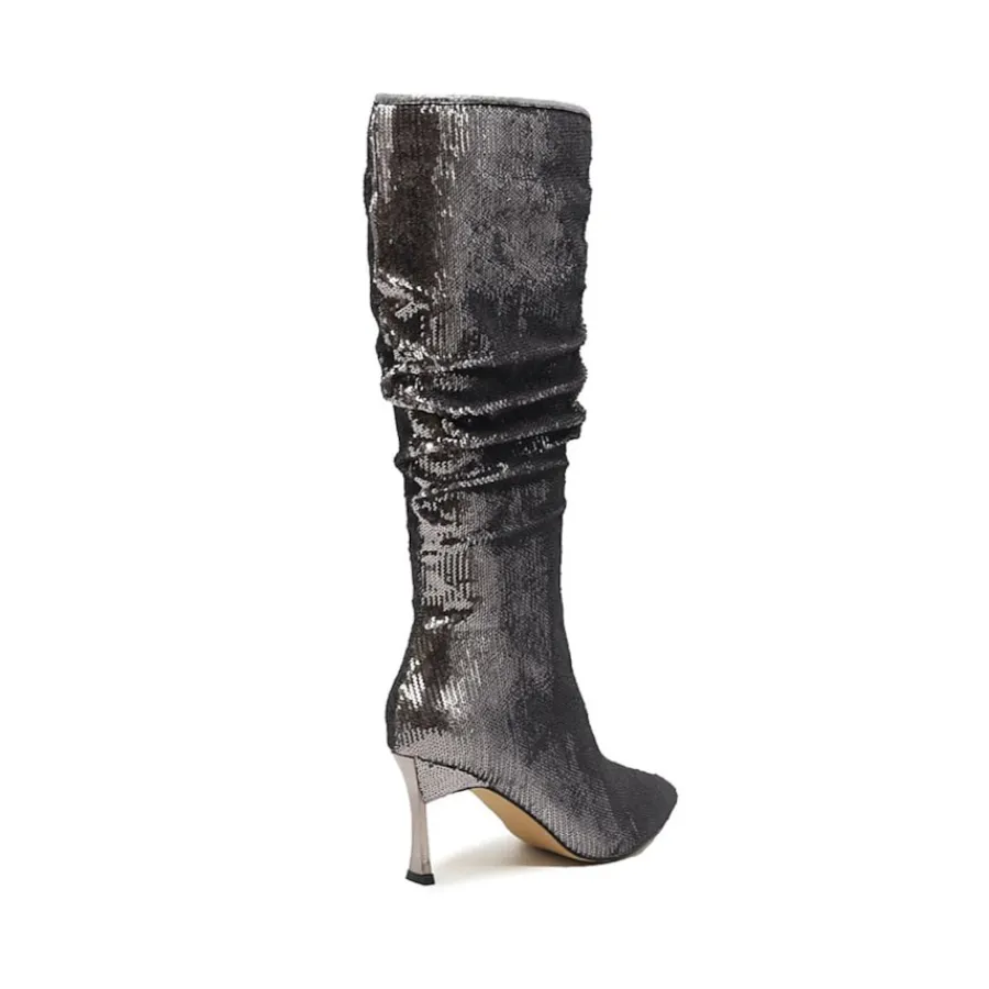 Fique deslumbrante com esta bota alta de lantejoulas com zíper interno. As lantejoulas brilham na luz para lhe dar um visual noturno deslumbrante. Essa bota é perfeita para usar em festas e eventos noturnos, sem perder aquele toque de glamour.Altura da cana 40 cmAltura do salto 7 cm