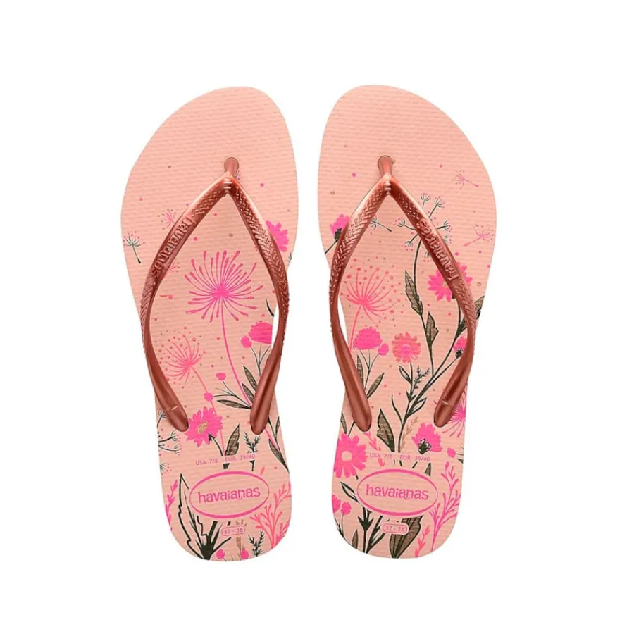 A Slim Organic é um dos modelos mais clássicos e atemporais das Havaianas. Combina o padrão de flores da sola com tiras metálicas e cores incríveis, os chinelos têm um estilo romântico e sofisticado. O formato Slim, com tiras e sola mais finos e delicados é um sucesso.