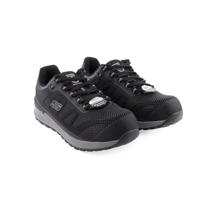 Mantém-te protegido e confortável com um bom visual desportivo usando os Skechers Work™: Bulklin Comp Toe. Design desportivo com uma parte superior em tecido de rede e material sintético durável com atacadores, biqueira de segurança em compósito com detalhes nos pespontos e uma palmilha com amortecimento Skechers Air-Cooled Memory Foam®.