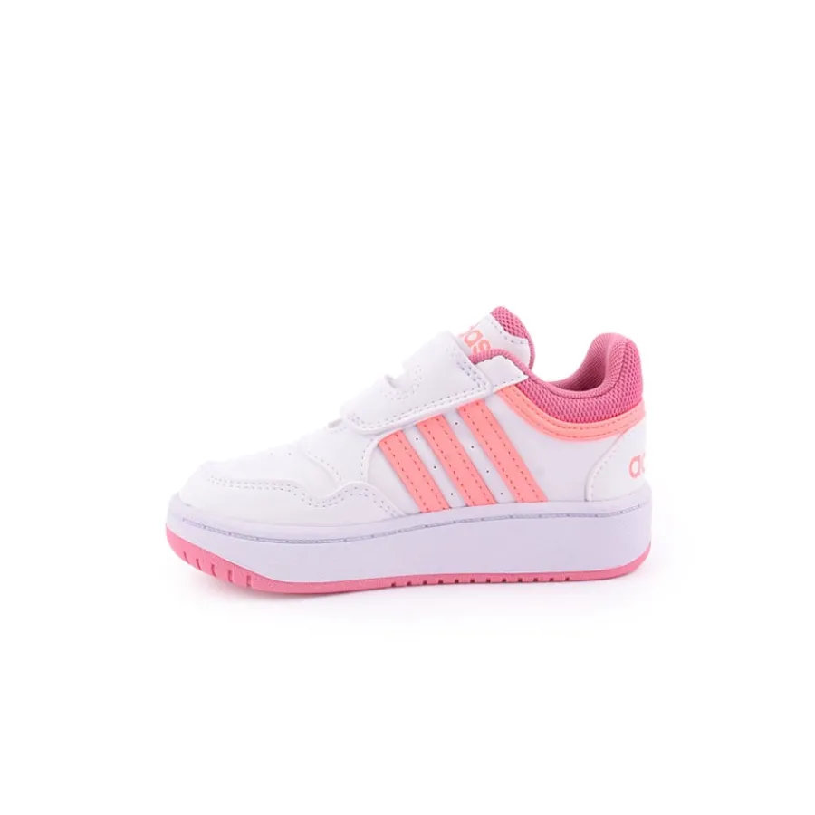 Mantém o teu pequeno confortável com as sapatilhas Hoops 3.0 da adidas para criança.- Tamanho: Criança.- Parte superior em sintético.- Cor: Branco.- Detalhes a cor-de-rosa.- Ajuste com tiras de velcro.- Cano almofadado.- Sola exterior de borracha.- 3 riscas nas laterais.- Logo Badge of Sport na língua e entressola.