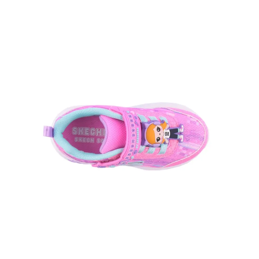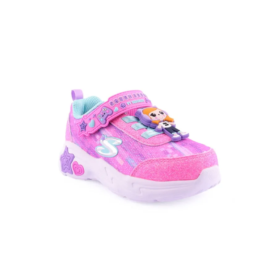 Brilhe e brilhe com seus personagens favoritos do Skech Squad com o Skechers Snuggle Sneaks – Skech Squad. Este design temático de personagem apresenta um cabedal sintético e tecido com acabamento brilhante, cadarços elásticos, pingente de cadarço do personagem, fecho adaptável Skechers e palmilha acolchoada e confortável. Chaveiro bônus do personagem Skech Squad incluído como brinde na compra.