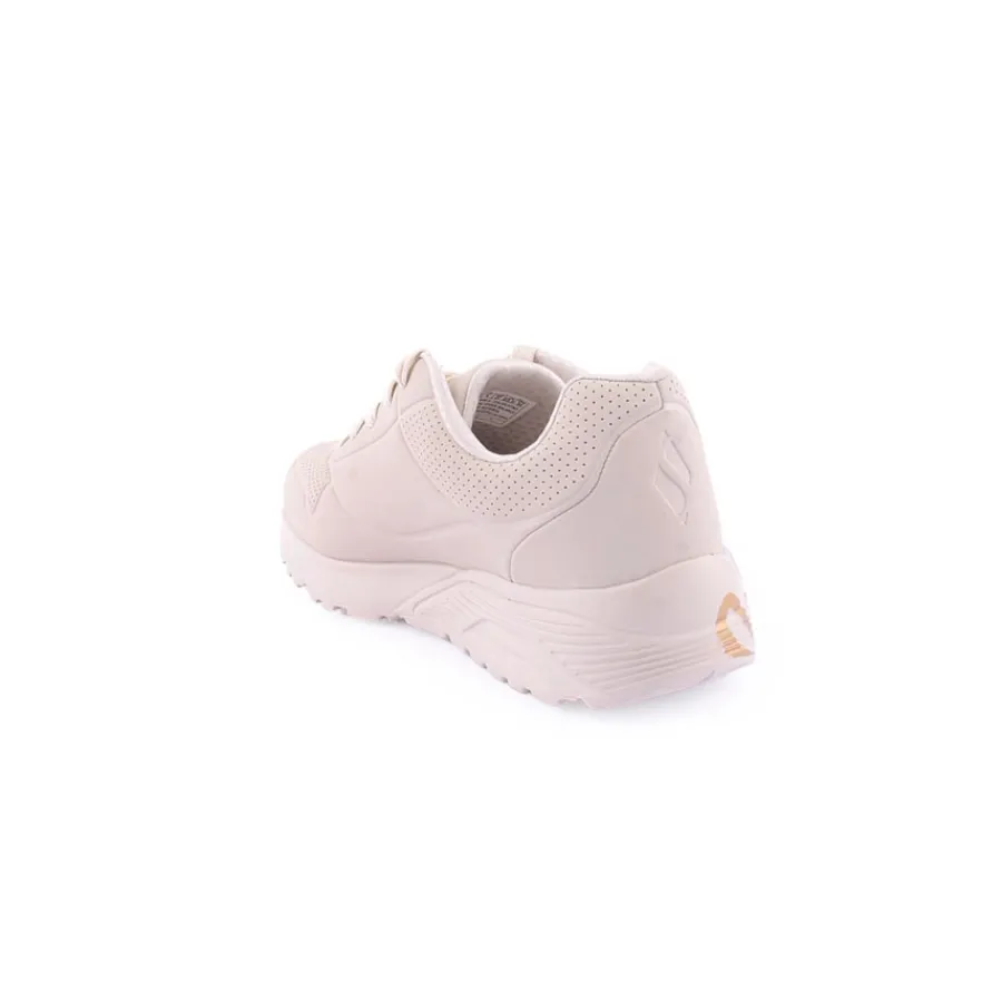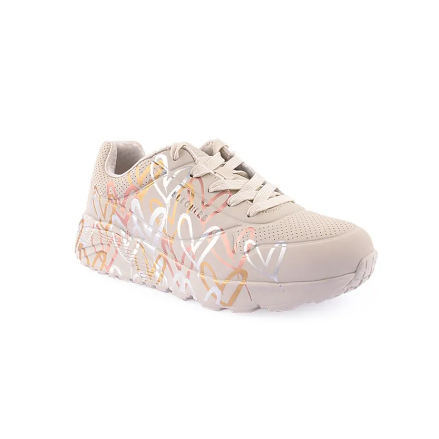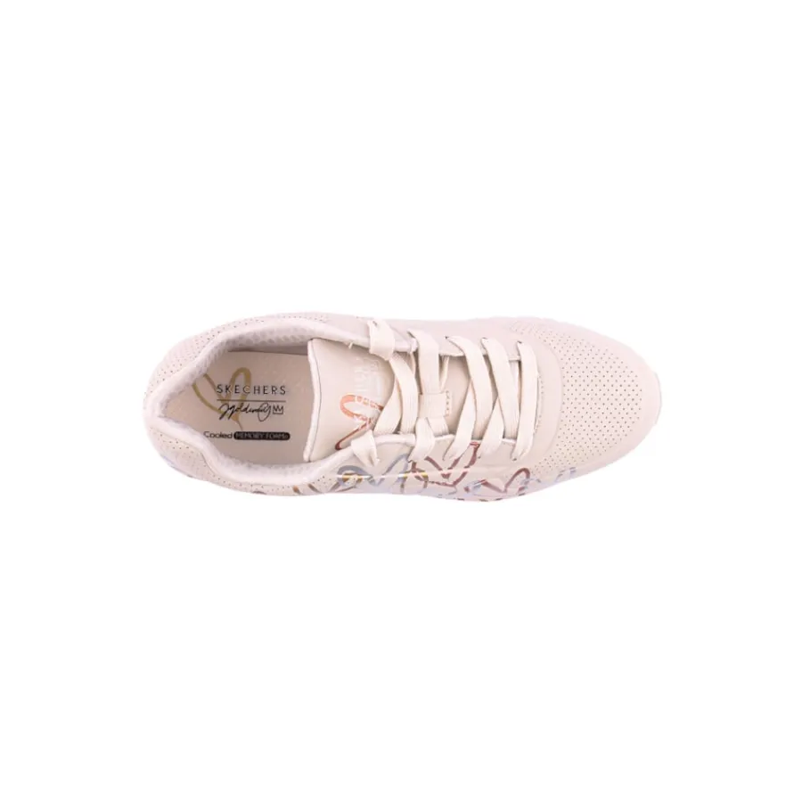 O muralista de renome internacional James Goldcrown traz à Skechers os seus emblemáticos designs com corações #Lovewall nesta colaboração inspiradora. Mostra o teu estilo criativo com as Skechers Street™ x JGoldcrown: Uno Lite – Metallic Love. Estas sapatilhas modernas com atacadores têm uma impressão metálica do design de coração de graffiti caraterístico do artista que se estende até à entressola, parte superior em durabuck sintético e acabamento perfurado com palmilhas Skechers Air-Cooled Mem
