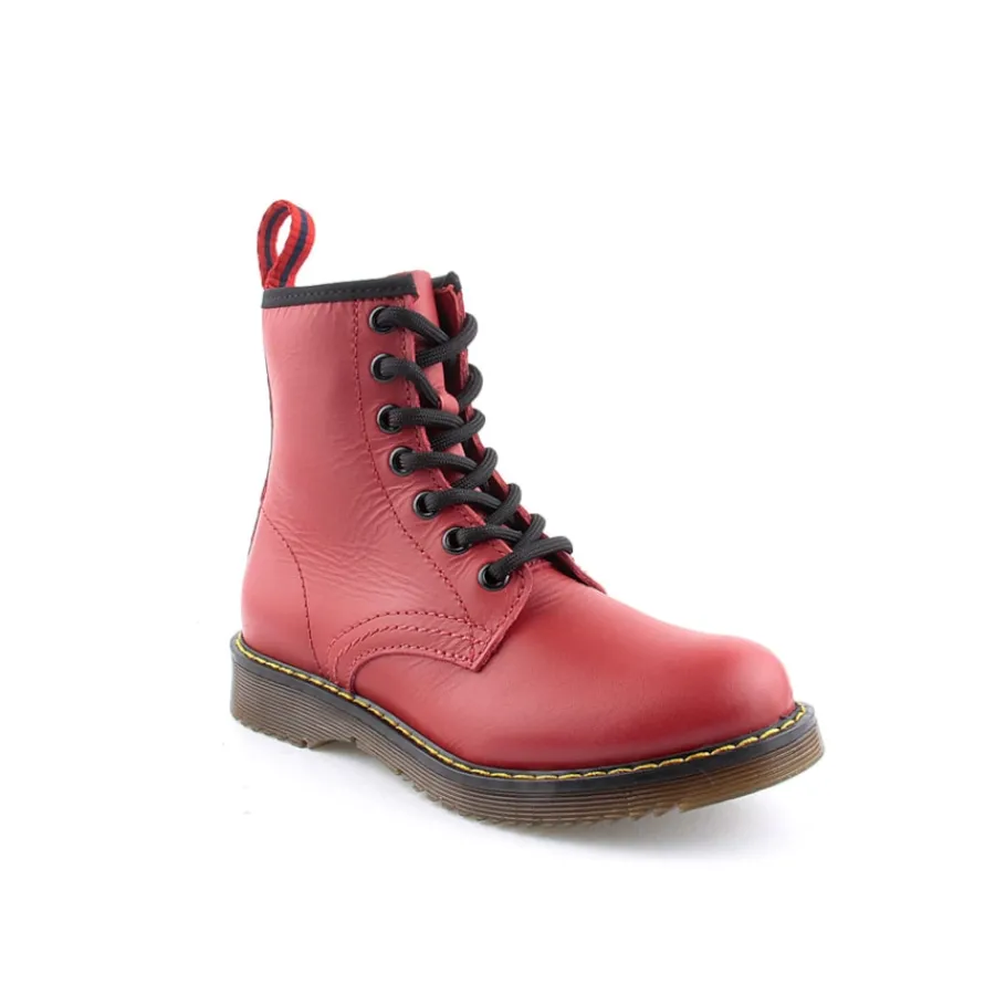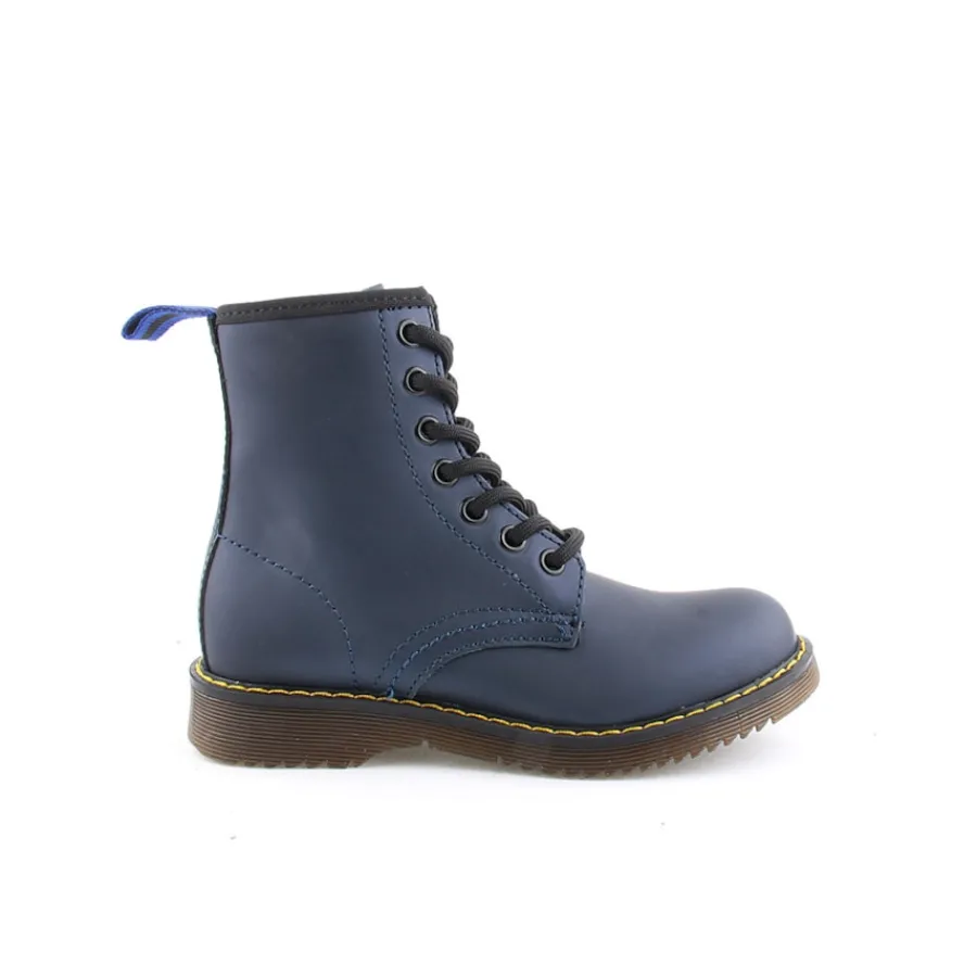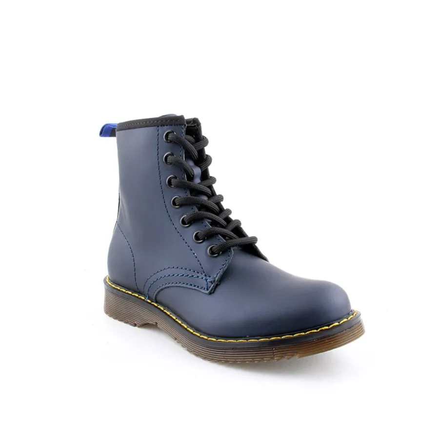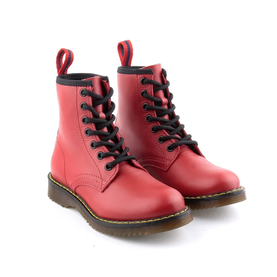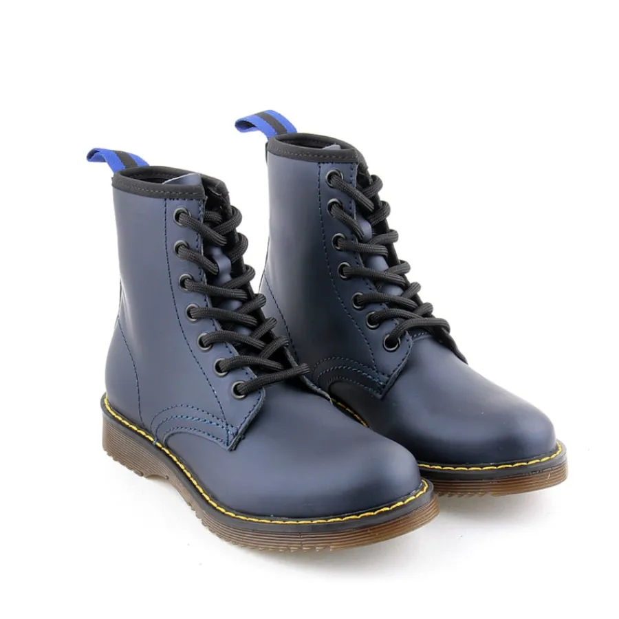 Bota em pele, estilo militar para criança. Disponível nas cores azul, branco e vermelho.