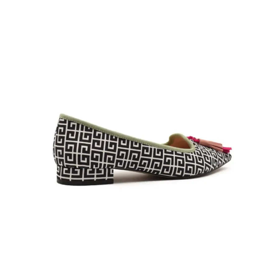 Desfrute de elegância e estilo com estas lindas sapatilhas femininas neste verão. A estampa em preto e branco confere um toque clássico e versátil a qualquer look, enquanto as borlas rosa e fúcsia conferem um charme feminino e lúdico. O acabamento em verde menta adiciona um toque refrescante e único a este design sofisticado. Essas sapatilhas são a fusão perfeita entre conforto e moda, ideais para usar de dia ou de noite, proporcionando um equilíbrio entre estilo arrojado e detalhes charmosos.