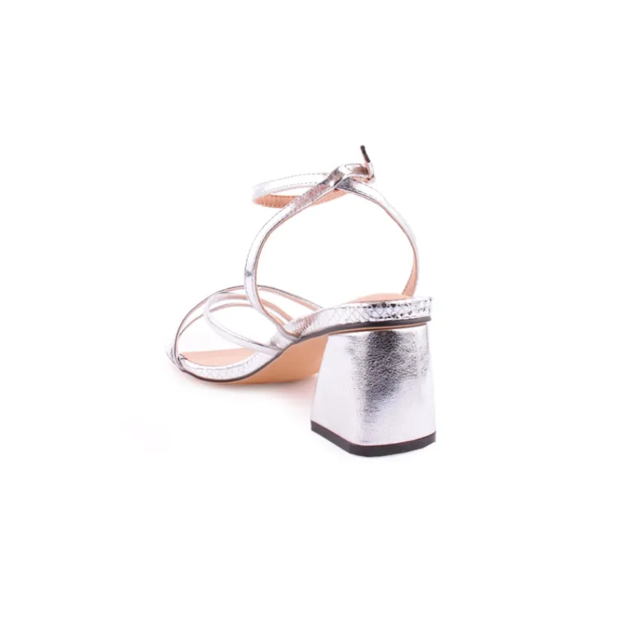 Sandália metalizada de tacão largo para mulher, com estampa de cobra e fecho de fivela.Salto com 6cm de altura.