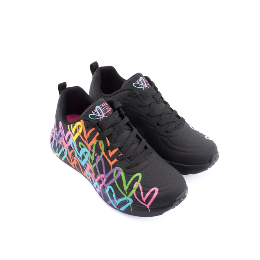 Os ténis Skechers JGoldcrown Uno Lite – Heart of Hearts para mulher foram concebidas pelo muralista de renome internacional James Goldcrown. Ele traz os seus icónicos designs de corações #Lovewall para a Skechers nesta colaboração inspiradora.Estes ténis modernos com atacadores apresentam uma impressão do icónico design de coração do artista que se estende à sola exterior, uma parte superior em durabuck sintético e uma palmilha perfurada com uma palmilha Skechers Air-Cooled Memory Foam, além de