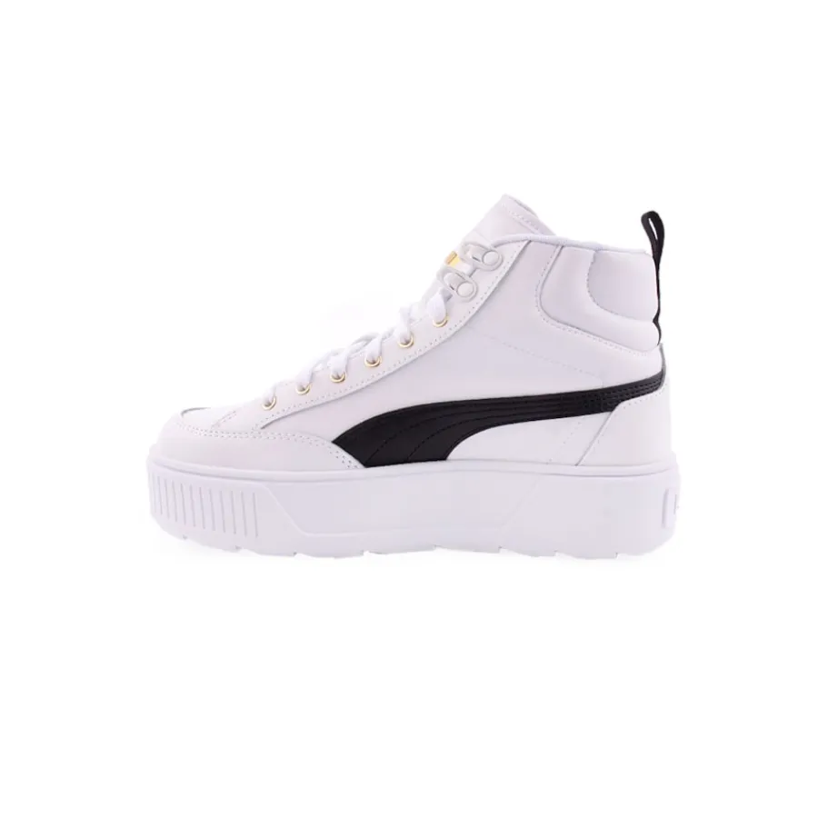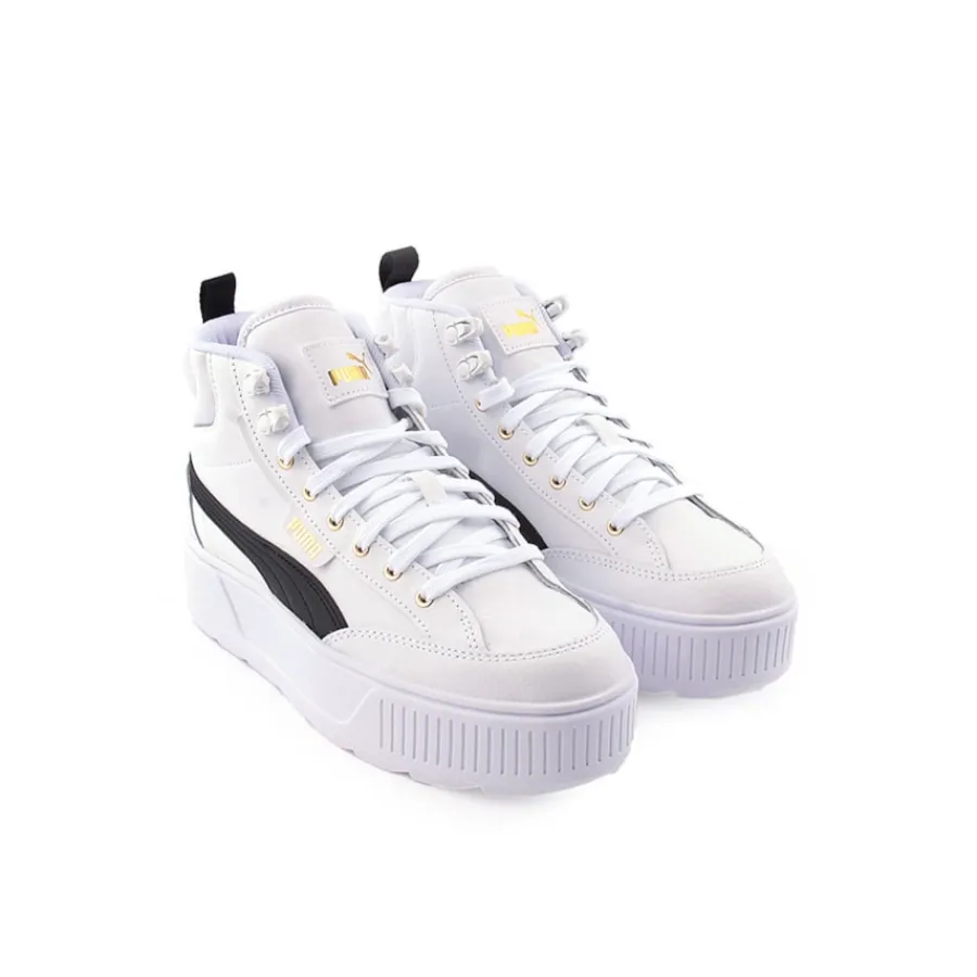 Karmen Mid entra na zona com sua atitude especial. Um verdadeiro perfil de ferramentas de plataforma com design de sola robusta. A parte superior limpa apresenta material de couro mate e liso. Os logotipos são finalizados com uma execução real de folha de ouro. Este estilo é a combinação perfeita de um sapato esportivo e clássico que combina com qualquer um dos seus estilos. Além disso, a gola de cano médio, os ganchos de metal e a sobreposição dos dedos de grandes dimensões proporcionam uma apa