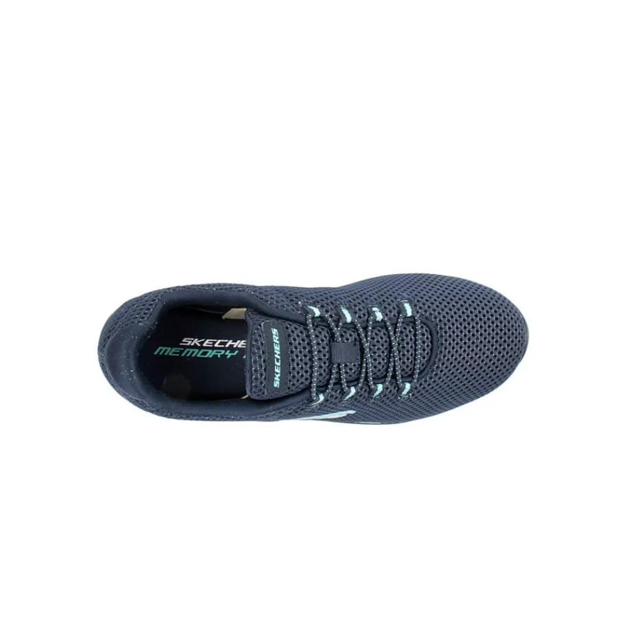 Sapatilhas de mulher Skechers 12985 NVLK, em azul. Uma sapatilha de elástico e com palmilha de espuma de memória arrefecida a ar garantem o conforto a que já está habituado com a Skechers.