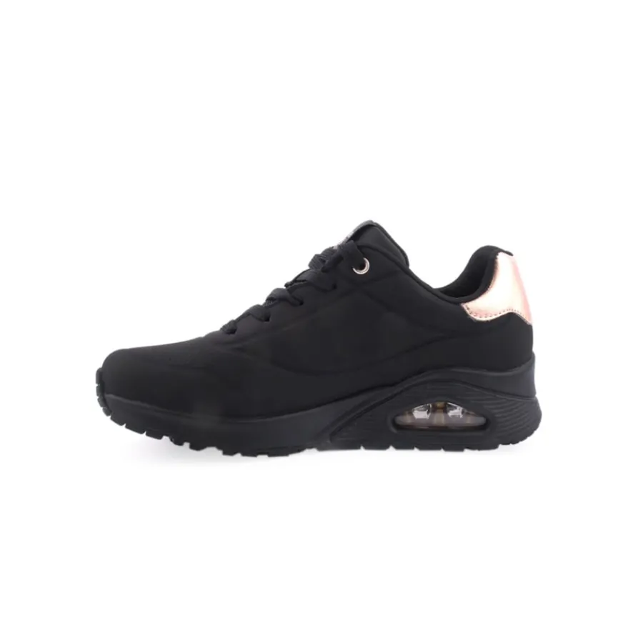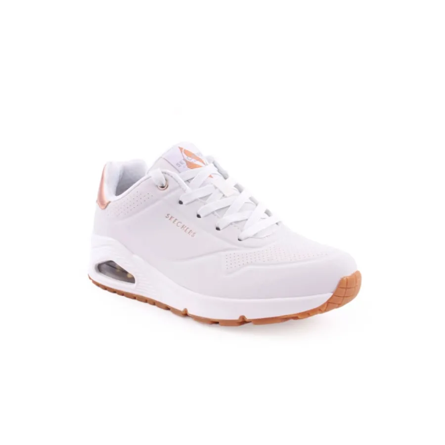Escolhe o ouro e melhora o teu estilo com Skechers Street™ Uno – Golden Air. Este modelo moderno com atacadores apresenta uma parte superior em material sintético durabuck com destaque dourados, palmilha almofadada Skechers Air-Cooled Memory Foam® e uma entressola com caixa de ar Skech-Air® visível.